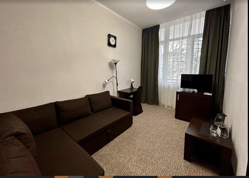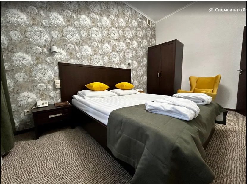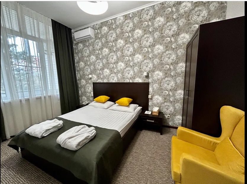 Площадь номера - 35 кв.м. 2 осн. места. 1 доп. место. Балкон. Мебель: вешалка, диван, зеркало, кресло (два), кровать двуспальная, прикроватные тумбочки, столик журнальный, стул, шкаф. Оборудование: кондиционер, телевизор, телефон, холодильник, чайный набор посуды, электрочайник. Санузел: с душевой кабиной, туалетные принадлежности, фен. Сервис: Wi-Fi бесплатно, мини-бар, смена полотенец (через 3 дня), смена постельного белья (через 3 дня), уборка номера (ежендевно).