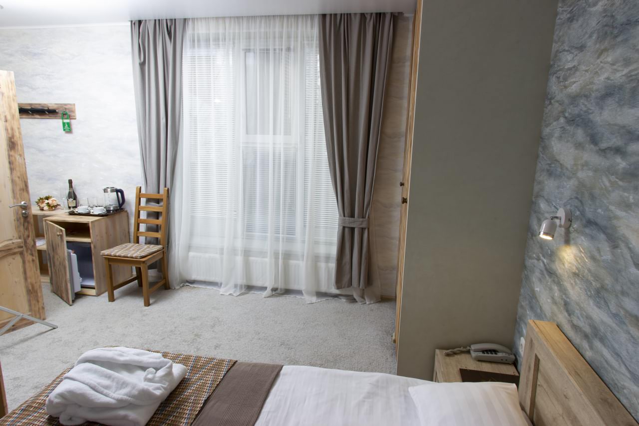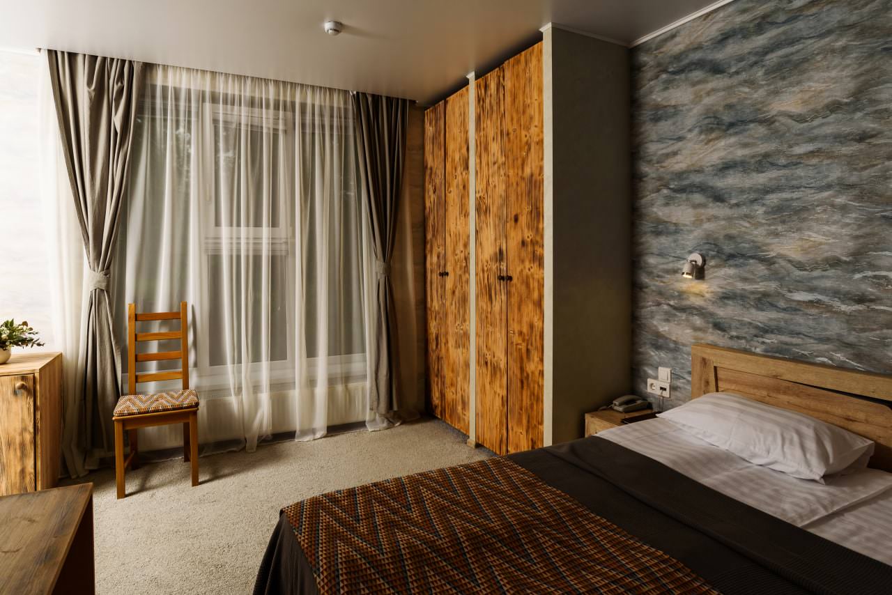 Площадь номера - 25 кв.м. 2 осн. места. 1 доп. место. Мебель: вешалка, зеркало, кровать двуспальная, прикроватные тумбочки, стол, стул, шкаф. Оборудование: кондиционер, телевизор, телефон, холодильник, чайный набор посуды, электрочайник. Санузел: с душем, туалетные принадлежности. Сервис: Wi-Fi бесплатно, мини-бар, смена полотенец (через день), смена постельного белья (через день), уборка номера (ежедневно).